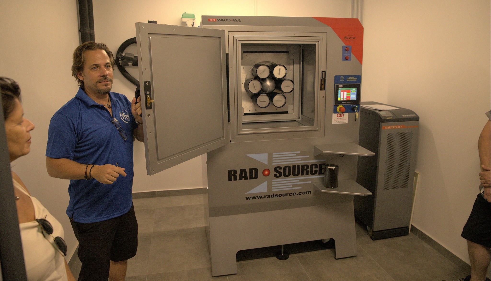 Jérôme Marie, a research engineer at the Institut Louis Malardé in front of a sterile insect irradiator