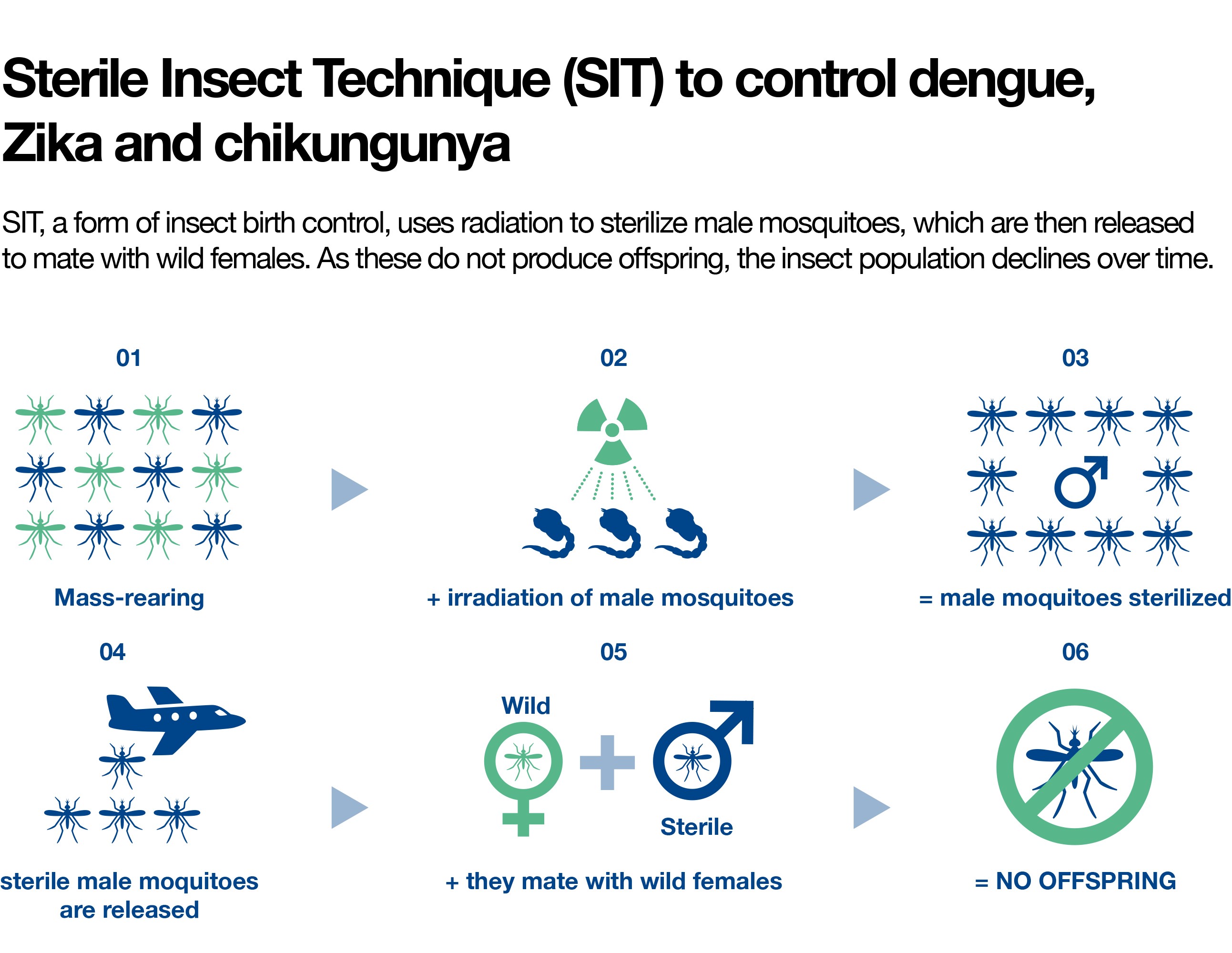 The Sterile Insect Technique (SIT) is a form of insect birth-control using irradiation. The process involves breeding and segregating billions of male mosquitoes in dedicated facilities, sterilizing them with x-rays and then releasing them to mate with females in the wild. As the females don’t produce any offspring, the insect population declines over time. The technology has been used in the agriculture sector for decades with great impact and low environmental risk and is now being applied to target human diseases transmitted by mosquitoes such as dengue.